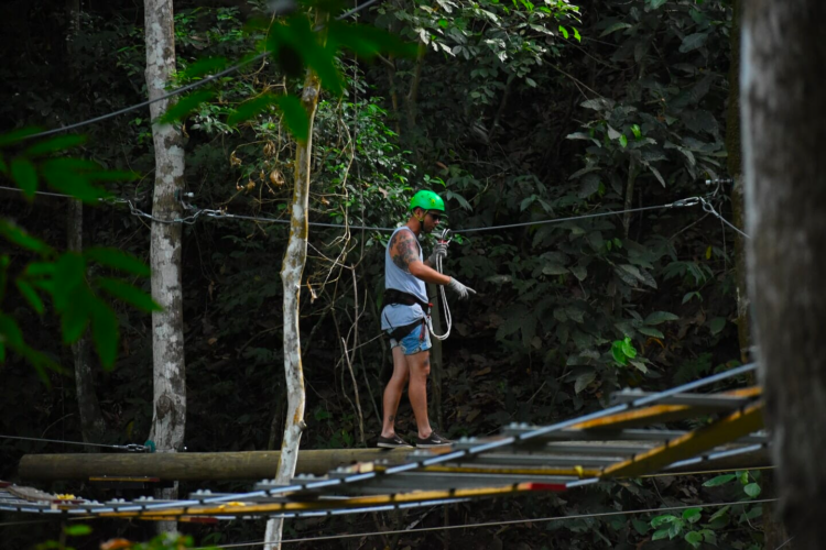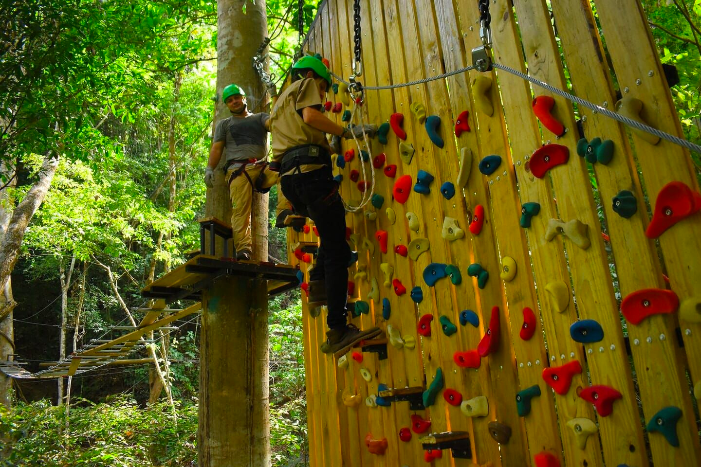 At the end, you will have to resolve your descent using a wall with climbing holds; this is where, with great relief and pride, you end this spectacular adventure in the forest coming back with our guide through our trials