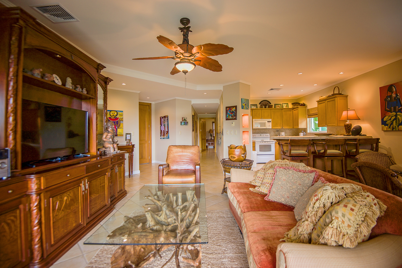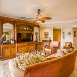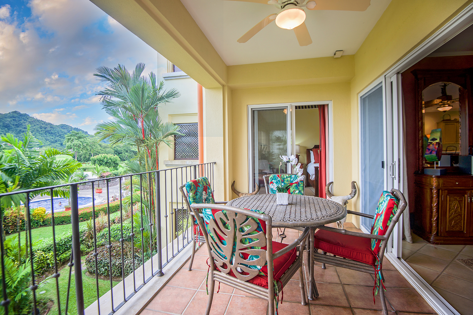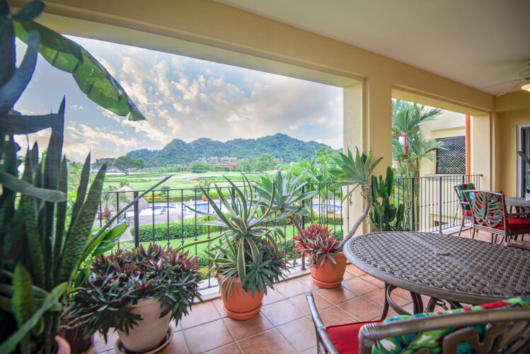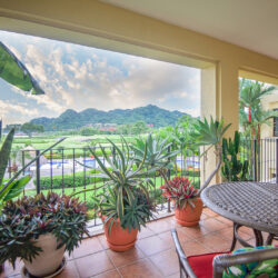 The classic Mediterranean architecture of the Del Mar buildings grace this professionally decorated top floor unit, which features wrap around covered terraces off the living room and master suite, as well as expansive views of the golf course, the resort and Herradura Bay, and plenty of outdoor furnishings for the enjoyment of reading, lounging, and sunset cocktails.