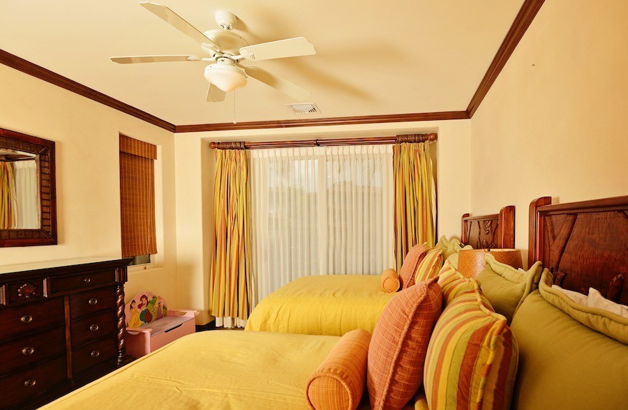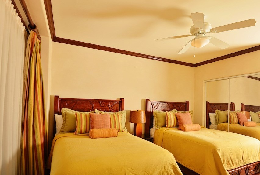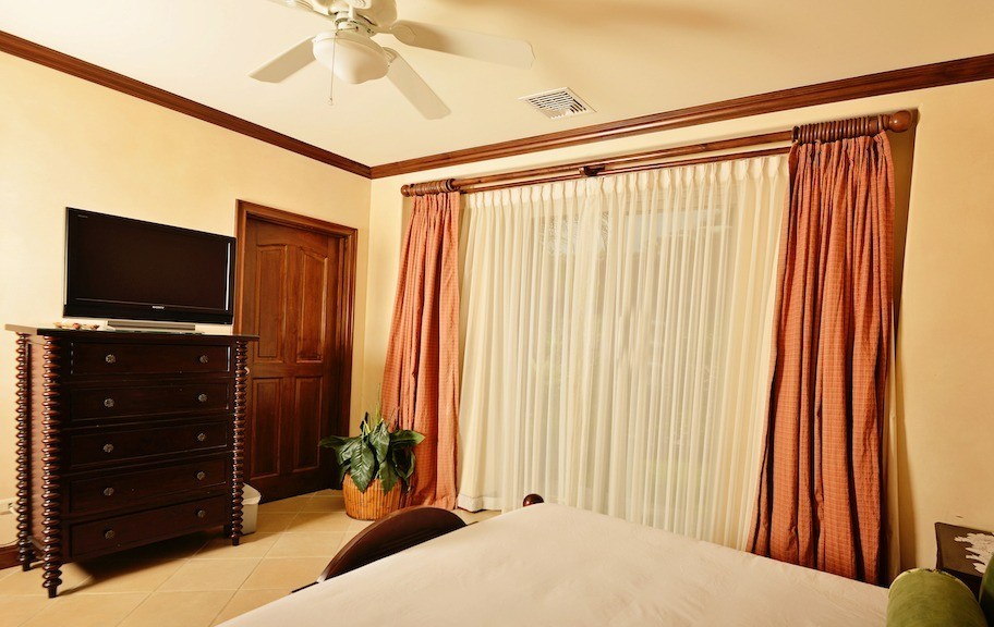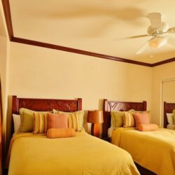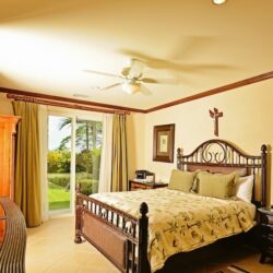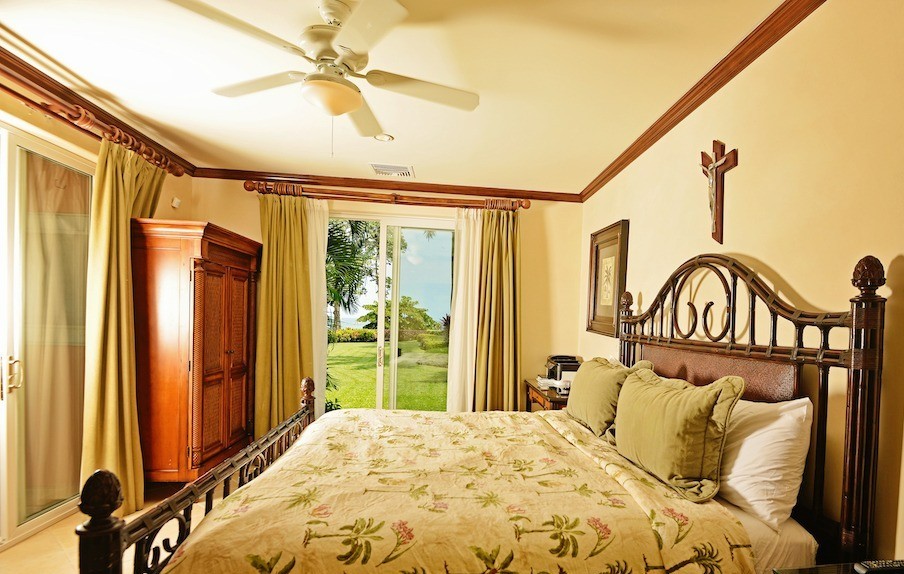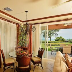 The master suite opens onto the wrap-around terrace, as does one of the two other bedrooms. Wicker and dark wooden furniture, ceiling molding, and decorative accents complement the creamy ceramic tile flooring and muted colors to recreate the elegant simplicity of tropical living. Wall-to-wall French doors emphasize the feeling of light, airy, and spacious interiors and provide a seamless transition from inside to out. Hedges screen the covered ground-level terrace of this corner unit, which leads on to the adjoining lawn and gardens. The gently crashing waves on the beach further a sensation of a tropical lifestyle to delight any group of close friends or family of adults.